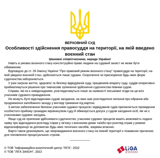 - Закон України "Про правовий режим воєнного стану" – визначає загальні правила функціонування державних органів, включаючи суди, під час воєнного стану. Згідно зі статтею 26 цього закону, скорочення чи прискорення будь-яких форм судочинства забороняється.